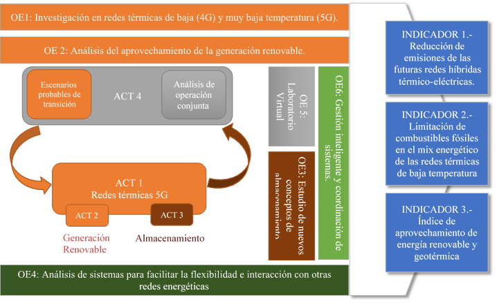 El objetivo de esta actividad es profundizar en la mejora del aprovechamiento del potencial energético y económico de las redes de baja y muy baja temperatura bajo una perspectiva global, abordando todos los puntos clave: diseño, adaptación, observabilidad y controlabilidad, teniendo en cuenta que es el soporte físico de las actividades de generación y almacenamiento.